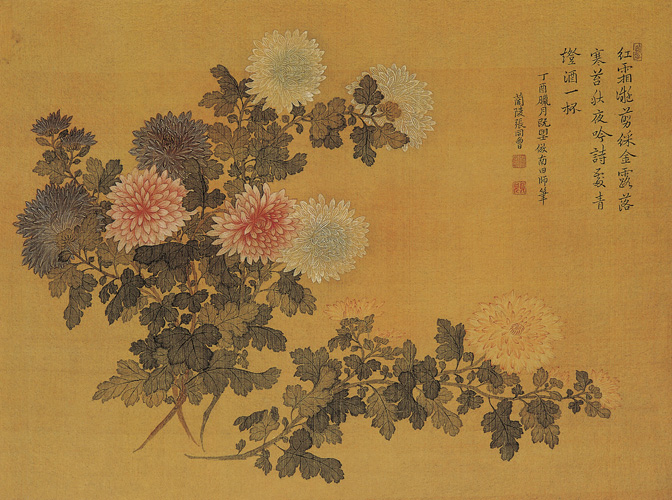 图绘秋菊满幅,繁簇似锦,争奇斗艳,生机勃勃,表现出秋菊傲霜的品格。此画用笔劲健洒脱,菊花结构缜密,设色淡雅,满纸菊花一气呵成,充分体现出作者的高深功力, 张同曾的这幅《菊花图》设色表现出菊花的娇艳,笔墨轻松流利,很有特色。