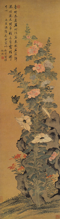 彩画秋葵、蛱蝶、玲珑石。作者王武(1632—1690),长洲(今苏州)人,精于鉴别,先世富收藏,多宋元名迹,往往心识手追,于传统颇有领悟。王氏花鸟写生在沈周与陆治之间,王时敏许无画院气。此图风貌近沈周,色调沉着凝重,画上自题七言诗一首,作于清康熙二十五年,时年50岁。