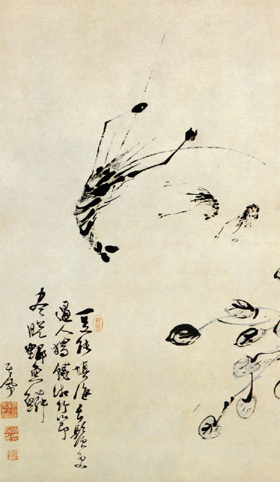 高其佩(1660—1734),字韦之,号且园,别号南村等,辽宁铁岭人,因父荫授官宿州知州,官至刑部侍郎。中年以后开始用指头绘画,所画花木、鸟兽、鱼、龙和人物,无不简括生动,意趣昂然。《虾图》构图简略,运墨功夫深厚,点染随意颇得意趣。常以笔断意连,于平淡中见神韵。