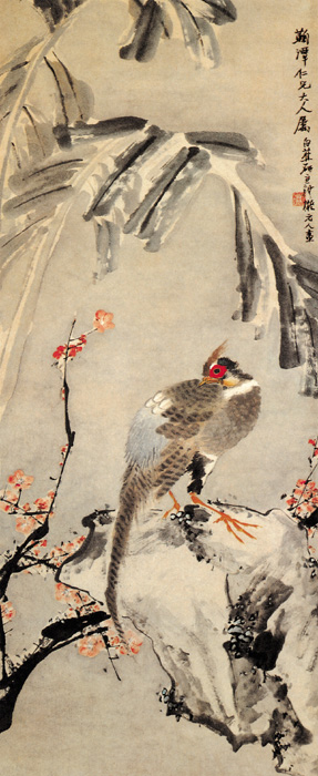 王礼(1831—1879),字秋言,号秋道人、蜗寄生、白蕉研主。江苏吴县人,海上画派前期的杰出画家之一。此画绘梅花锦鸡,设色妍丽淳厚。