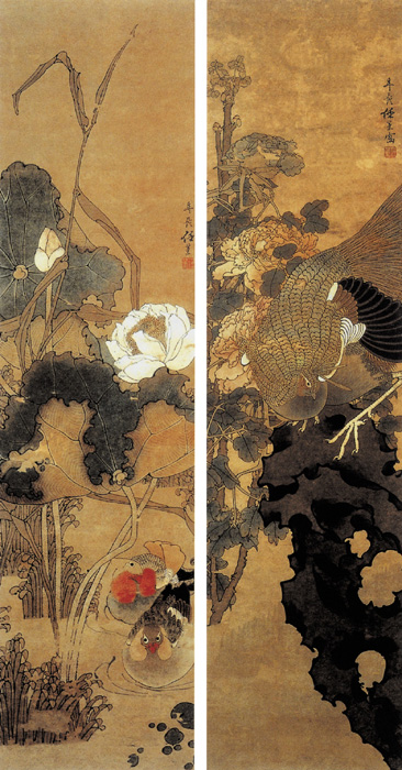 此屏虽均为花鸟,然彼此迥异,相映成趣。右边一幅,石上静停一鸟,似倾听,边上牡丹盛开,丰繁而静谧;左边一幅右下脚画有依依一对鸳鸯,顶上荷叶衬托的荷花生机勃勃,辅以苇草丛丛,富有生趣。内容虽纷杂,但布局井井有条,景象壮阔,疏密相当,在敷色上面,尤见浓淡的匠心。