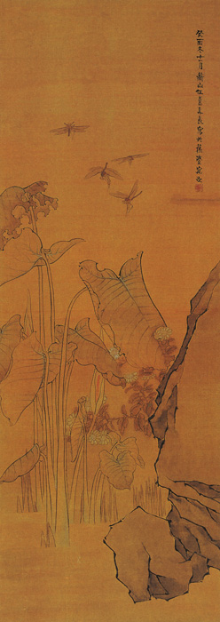 任薰(1835─1893),近代著名画家,字阜长、舜琴。长期在上海以卖画为生。工书善画,长于花卉、禽鸟,取境布局,不落前人规范,能独创一格。此图画荷花和四只神态各异的蜻蜓。