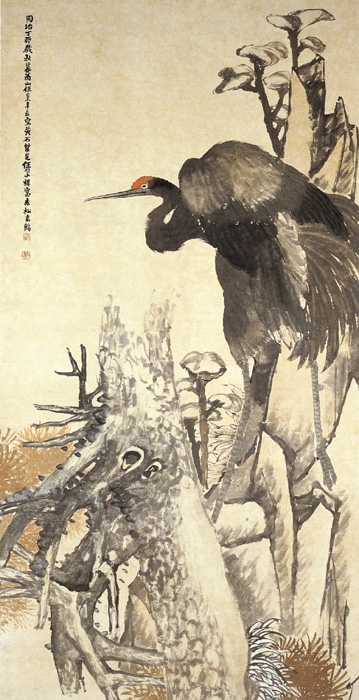 此图用勾勒填彩法绘一长嘴仙鹤、兰花、岩石和枯木。勾线如铁划银钩,赋彩浓淡并用,兰花、竹篁,花鸟的造型异常饱满,略呈图案化,尤其是鹤的处理更富于装饰性,可以看出受到民间美术的影响。