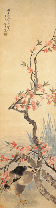 任薰的绘画明显地继承了陈洪绶的风格,虽没有陈的高古、清逸之趣,却显得通俗平易,能收到雅俗共赏的效果。此图绘桃花和在岸边歇息的鸟。岸边青草习习,桃花灿烂多姿。
