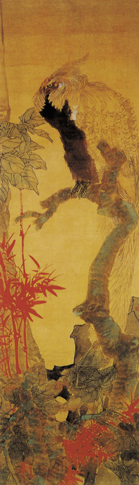 任颐在人物、肖像、花鸟等领域中都有很高的造诣,他的花鸟画兼工带写,色彩清新,形象活泼生动。《朱竹凤凰图》中朱竹白凤相映生辉,富丽典雅,凤栖梧桐,缩头敛羽,神情自若。此类题材,可兆喜庆,流传于民间,极富装饰意味。