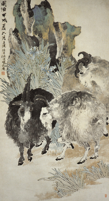 任颐(1804—1895),初名润,字小楼,后改字伯年,浙江山阴(今绍兴)人,寄寓浙江萧山。其父工写照,伯年幼得父教,后随任熊、任熏学画。擅画人物、山水、花鸟,尤工肖像。取法陈老莲,且重视写生,但可贵的是他能创新,而且有自己的画风。此图绘三只羊,一黑,两白,后有岩石和兰花。