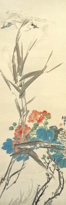 任颐捕捉瞬间诗意的想象力和表现力,得之于他的长期的写生功力和体物的观察入微。他的画,具有一种娴熟的一挥而就的速写性。而其设色的工丽,用水粉的巧妙,色光纷呈的节奏气韵,在此幅《寒塘归鹭图》中有上佳的表现。此图绘寒塘、鹭鸶、芦苇和牡丹。