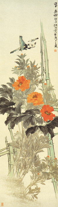 任颐大胆地尝试各种鲜丽的颜色,在统一的色调中,使用补色对比,一幅画中往往用一点极为夺目的红色、蓝色或橙色,这种统一色调中的补色运用,使画面明快利落,像闪闪发光的宝石,取得“画眼”的效果。如《红芍药图》中描绘的红芍药,很是艳丽多姿,蝴蝶翻飞,轻盈灵动。
