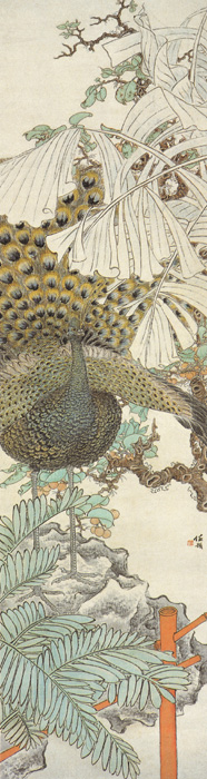 任预(1856—1901),字立凡,浙江萧山人,任熊之子,在上海、苏州一带卖画,画艺得到了任熊、任薰的指点,擅长画人物、山水和花鸟。构图别致,设色淡雅,花卉学宋人勾勒法。此图绘芭蕉树和孔雀开屏。