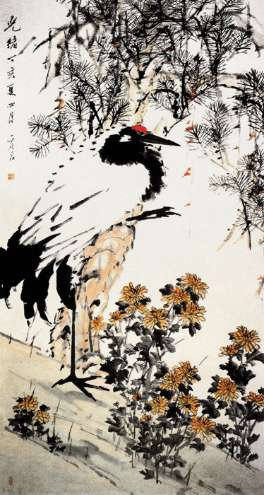 此图是极为潇洒豪放的写意画,与常见的以松、鹤为题材的作品不甚相同。画面斜出构图,坡上野菊丛生,十分繁茂,凸现出勃勃生机,菊叶以淡墨色渲染,菊之花瓣则是鲜明的黄色。地面设淡青色,立一丹顶鹤,颇有伟岸之势,作者用笔粗犷熟练,全用粗笔点染,而鹤之情态、神情、动势已被表现得极为传神。鹤后面是一株松树,挺直峭立,不卖弄做作的虬劲之态,给人以生机盎然、蓬勃向上的感受。