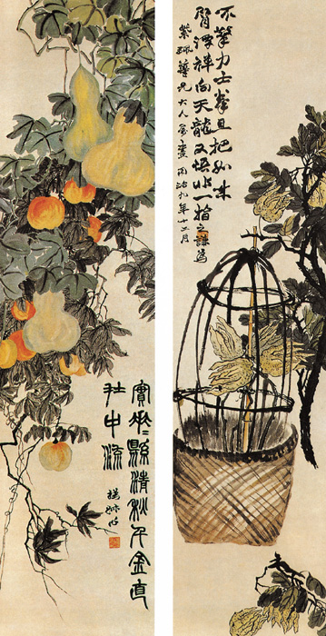 清 赵之谦 纸本设色 纵243.9厘米 横60.2厘米 (日)大阪市立美术馆藏 赵之谦(1829—1884),字撝叔,号悲盫,会稽(今浙江绍兴)人。官至江西鄱阳、奉新知县。擅篆刻、书画。花卉继承陈淳、“扬州八怪”的传统,并融合金石篆刻,笔势流动,结构新颖,是近百年来著名画家之一。所画花果树木具金石味,画中一屏题:“百子千房奇树传,领取宰相记十年。撝叔。”三屏题:“实花花悬清秋,千金直在中流。撝叔作。”四屏题:“不擎力士拳,且把如来臂。浮禅向天龙,又悟非一指。之谦为紫佩尊兄大人属画。同治九年十二月。” |
