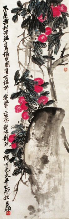 吴俊卿(1844—1927),原名俊,字昌硕,号缶庐,又号苦铁,浙江安吉人。工篆刻、书法,善画花卉,近效赵之谦、张学广,远师陈淳、徐渭、朱耷、原济。墨笔设色,无所不工,又常以篆法入画,笔力雄健,气韵磅礴,为近代画家之一。是继任伯年而起的海派主将。吴昌硕工诗书纂刻,擅石鼓文,善画花卉竹石,被称为“雄健古茂,盎然有金石气”。图中荔枝,直干耸出,迥殊凡态;枝头果实实,信手点染,表现得十分腴润。