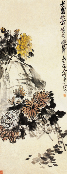 《菊石图》是吴昌硕以惯用的斜对角章法而作,集中在画面左边,靠顶角画有姚黄大菊,双钩花瓣,浓墨点叶,枝干上有两个花蕾,下面有巨石一块,数朵魏紫,中间隔着一朵白菊,昂首怒放,风姿绰约,浓墨深叶衬托着花朵,花枝扶疏,画之右下角点着大小不同的墨点,各种盛开的菊花,呈现出鲜艳多姿,神韵秀丽,凌风傲霜,可见画家寄托着他清高脱俗的精神品格。