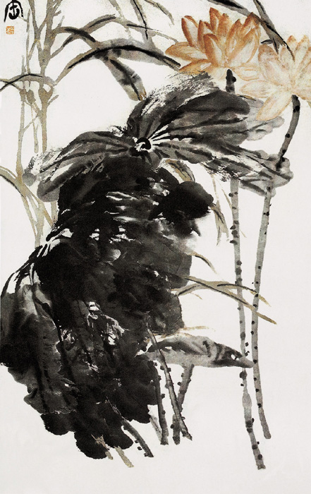 《红荷图》似不经意,布局却很别致,仅画三张荷叶,占有画面绝大部分,因他用羊毫软笔,画荷叶、荷梗任情挥洒,奔放雄秀,湿笔有韵,枯笔有气,淡而不薄,深而不板,刚柔相济,润而不洇,笔笔有力,墨法笔滋,意境清新、静穆。二朵红荷敷薄色,质朴而惹人注目,芦苇纯以淡色出之,与荷叶深墨成对比,主次有别,层次分明,气势磅礴,是真正的大写意,具有独特的格调。