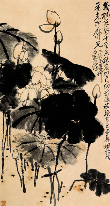 王震(1867—1938),字一亭,号梅花馆主、海云楼主。生于吴兴(今浙江湖州)北郊白龙山麓,故四十岁始以白龙山人为号。平生信佛,法号觉器。山水、花卉、翎毛、佛像兼长。此画中荷花师从吴昌硕,为大写意,笔力虬劲而老辣。