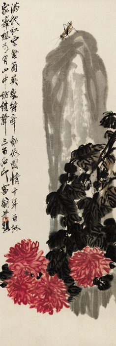近代 齐白石 纸本设色 纵98.9厘米 横33.2厘米 齐白石(1863—1957),中国近、现代中国画家、篆刻家, 原名纯芝, 后名璜, 字渭清, 又字兰亭, 号濒生, 别号白石山人、寄园、寄萍堂主人、阿芝、三百石印富翁、湘上老农等。齐白石生于湖南省湘潭县农家, 他自小砍柴, 上了半年村馆就学木匠, 给人作雕花家具。此幅作品,笔墨与构图,俱臻佳妙,一叶红菊,斜垂画中,色彩鲜妍,视以淡墨石头,气势峭拔,石上著一纺织娘,更添生趣,自题云:“满地红云粲菊英,题诗牵动故园情,十年百劫家难想,可有山中纺绩声。” |