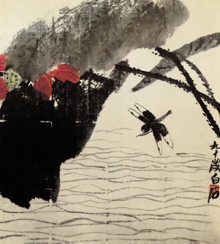 齐白石诗词、篆刻、书法无不精工,山水、花鸟、昆虫、人物等都有很高的艺术成就。此画构图奇特,一花、两叶,穿插得非常巧妙,尤其是几片朱红的花瓣,掩映于墨色的荷叶之中,色彩对比强烈而又十分谐和。叶间蜻蜓,款款而飞,俯视荡漾的微波,真使人夺“十里荷塘”之想。