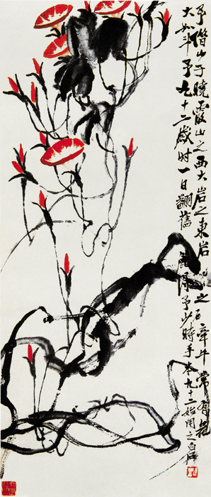 《牵牛花》是他晚年之作,画跋云:“予偕山子晓霞山之西,大岩之东,岩之牵牛,常有花大如斗。予九十二岁时,一日翻旧簏得予少年时手本,九十二始用之”。由此可知,画家所画之物,是他早年时的稿本中得来。他还曾为梅兰芳画过牵牛花,“梅畹华家牵牛花碗大,人谓外人种也。余画此最小者”。《牵牛花》用笔老到,聚散穿插很有讲究,笔力健爽,红的花朵,黑的墨叶,鲜明大方,形成墨线丛中朵朵红花,娇丽动人。