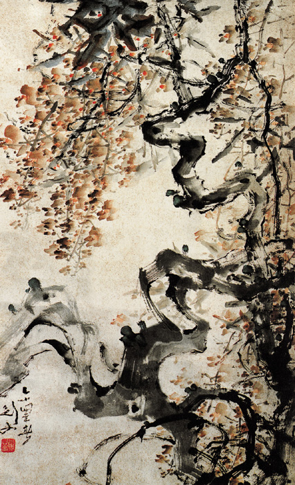 紫藤是高剑父常画的题材。此图以大笔画出主干,用笔的中、侧、偏、顿、挫的变化,宛如蛟龙腾跃,藤蔓曲曲弯弯,以墨色的深浅浓淡使物象主体分明,主干上的石绿苔点,使藤茎变得苍老而有变化,盛开的紫藤,一球一球重叠倒悬,花心是黄的,花瓣是紫色的,密密麻麻,布满画面的上下。画面气势博大,似乱非乱,构图严谨,变化多端,花的雍容,藤的老辣,犹如张颠的草书笔法,表达了画家视觉美感及独特的情思。