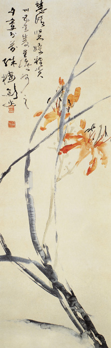 近代 高剑父 1946年 广州美术馆藏 高剑父青年时有机会看到广东四大收藏家所收藏的历代名画,并曾到喜玛拉雅山麓及印度、锡兰、缅甸、埃及等国写生,进行中外文化交流,扩大了他的艺术视野和多方面的艺术修养,开创了中国画的新境界。他的作品在比利时万国博览会中获最优等奖。在意大利万国博览会、巴拿马万国博览会获金奖。《萱花》以最简练笔法,古拙矫健,空灵豪放,苍莽浑厚。徐悲鸿对他的作品有如此评价:“高剑父之笔,苍茫多奇趣,当日本棉白鸩之幅,雄浑高古,足当近世名画,近来健密未复,所写祗简单寥寥数笔,菊花或石岩一片。” |
