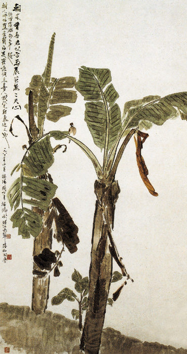 陈树人绘画最大的特点,就是注重写生,他常说:“写生绘画的基础,能写生詹后画中有物。”《蕉雀图》不受传统技法的束缚,是对景写生之作。他画蕉树干,一笔到底,用笔的变化不多,但却注意被折断了的黄叶子,已垂下伤失生命枯槁发蕉的叶子……干上的叶子,由于对景写生,状态各异,那弯曲垂下的叶枝上,站着一只麻雀,我们仿佛听到他喳喳的叫声。画家那清新、刚健、质朴感人的物象,使人感到亲切而新鲜。