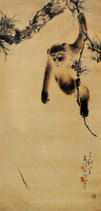 此画上有一老松,枯桠叉上,猿猴面向观众,上肢抓着松枝,双脚攀缘在树枝上,目不转睛地注视着下方,猿猴关切的心情,沟通了动物和人的心灵。高奇峰早年受其兄高剑父画学的影响,他间接地继承了居派花鸟画技法和风格,用笔的工秀和变化的微妙,画猿猴全身毛茸茸的,眼神、鼻孔、嘴巴的描述,具有严格的写生训练,解剖比例均合法度,技法精到,但不拘谨。画家充分发挥了渲染的技法,不仅猿身上的绒毛层层渲染,连背景月亮外的环境,也用淡色渲染。