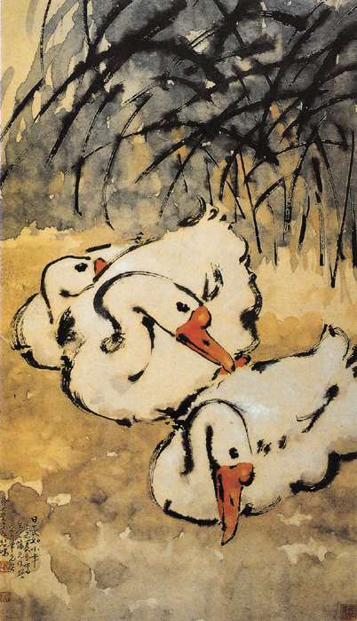 近代 徐悲鸿 纸本设色 1931年 此画左下角题:“日长如小年。辛未夏至写第二幅。元作赠宗白华兄矣。静文爱妻存。悲鸿。”以往不少人画鹅多画鹅群在水中游泳嬉戏的情景,此画所选取的描写角度和意境完全不同。画中的三只白鹅卧于岸边的沙土上休息,呈相互关爱状,画面充满阳光感,背景是一片生长茂盛的芦苇。画面色调给人一种暖融融的审美感受,画家借描写鹅与鹅的相互关系,似乎在抒发人与人之间相互应有的关心和爱护的情怀。此画在笔墨及设色上既有传统水墨写意画的特色,又借鉴吸收了西洋画的某些技法特点,如在环境色对鹅的白色羽毛用色的影响等。 |