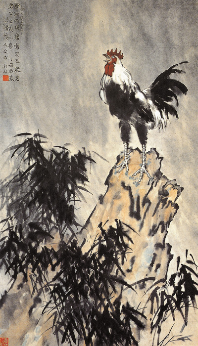 画左上题:“风雨如晦,鸡鸣不已,既见君子,云胡不喜。丁丑始春,悲鸿怀人之作。桂林。”题诗取自《诗经》风雨篇而另有寓意。1937年(丁丑年)日本帝国主义加紧对中国的侵略,画家借“风雨鸡鸣”的诗意来抒发自己的爱国之情。画中立于峻峭巨石上的一只冠红似火的大白雄鸡,挺胸昂首望天长鸣;石旁象征民族气节的墨竹丛生;背景为“风雨如晦”的漫漫长空。