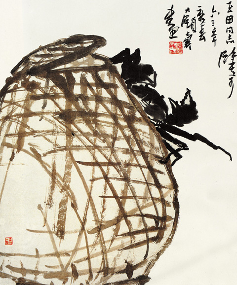 近代 潘天寿 纸本设色 潘天寿擅画写意花鸟和山水,远师徐渭、朱耷、原济(石涛)等人,近受吴昌硕影响;其画破常规、创新格,布局敢于造险、破险,笔墨浓重豪放,有金石味,色彩单纯,气势雄阔。书法从钟繇、颜真卿、史孝山人入手,后学秦汉、魏晋碑文,参以卜文猎碣。画中题识,疏斜跌宕,有黄石斋 (道周)风。善诗,能治印。亦画人物,并长于指画。这幅作品画一只肥大的螃蟹从盛蟹的竹篓里爬出来,很有生趣。竹篓用淡墨勾勒,清劲潇洒,螃蟹用重墨,笔笔写出,形象生动。淡色竹篓和重墨螃蟹,形成了对比,使画面富有节奏感和韵律感。 |