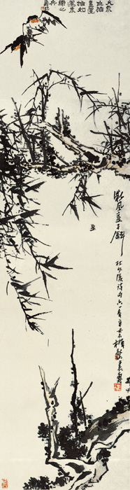 画史记载唐代画风狂放的张曾用指头辅助作画,清代有高其佩善以指作画,别开生面,高其佩后的300年,潘天寿(1897—1971)曾自谓:“老夫指力能扛鼎。”《微风燕子图》就是指画中的一幅精品。这幅指画,下部画古松枯干,枝干向上,与上部倒垂的枝相呼应。两只燕子居画幅的上方,一只作向上飞之态,一只作向下落之态,画得很是生动。整幅作品给人以峻拔细劲的艺术感觉,有一股独特的韵味。
