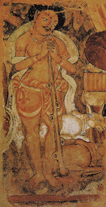 《牧牛图》画面用勾线法,线条质朴、沉着、劲健,色彩平涂。是新疆克孜尔第77窟的说法图壁画的局部。此图中尚残留佛陀的膝部。右下方一角可见溪流,其上为一棕一白两头牛匍匐在地。牛的前面,为画面中心人物兰达,他扶着多瘿的老树棍,侧目俯首,作凝神沉思状。