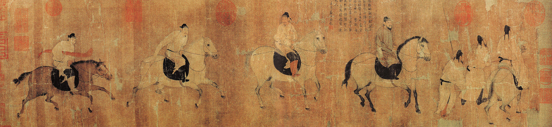 032 《游骑图》 唐 佚名 绢本设色 纵22.7厘米 横94.8厘米 北京故宫博物院藏 |