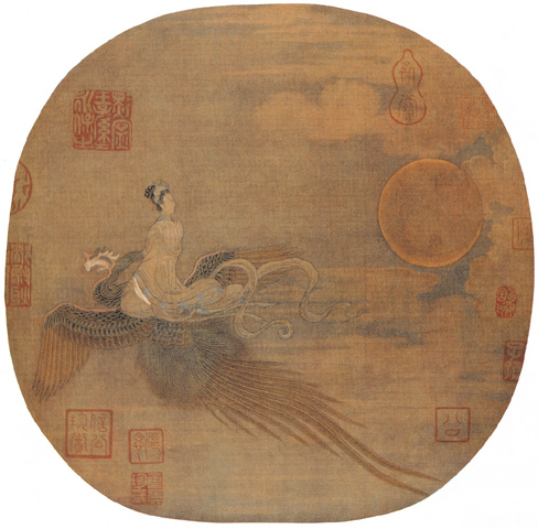 此图原载《历代名笔集胜册》第一册。耿昭忠题云:“风格高妙,飘飘然有凌霞绝尘之姿,是盖周文矩胸中迥出天机,故落笔超乎物表。张、吴、顾、陆、何难继踵。”《圣朝名画评》云:“周文矩,建康句容人。美风度,学丹青,颇有精思。仕李煜,为待诏,能画冕服车器人物仕女。”又云:“周文矩用意深远,于繁富则尤工。”按此图虽无款,而作风飞动精丽,允为北宋早期的作品。旧题周文矩作,今从之。