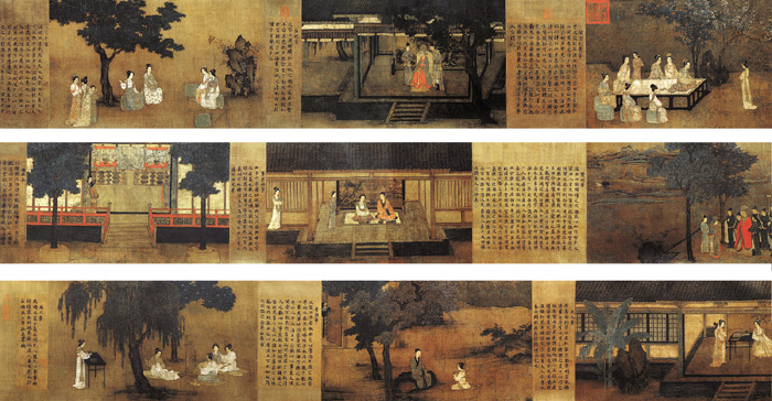 此图在艺术技巧方面,显示了典型的宋代风貌。流畅挺健的线条,准确洗练的造型,淡雅明快的设色,无疑是继承了李公麟以来的人物画传统,并达到了相当的水平。画中仕女或端庄或活泼,画家都一一状写了她们的举止动态和面貌特点。