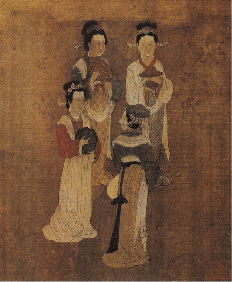 此图描绘了四个盛装的仕女。画家的技法相当出色,笔法活脱,线条流畅,造型准确,形象生动。线条的组织尤为出色,随人物形体动态的变化而增减疏密,依裙袖拂动而舒展长短,既恰当地表现了人体结构,又充分显示了笔法功力。四美皆窈窕柔弱而体态婀娜。
