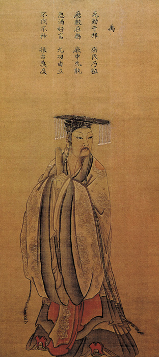 马麟,祖籍河中(今山西永济县附近),侨寓杭州。为南宋画院祗候。出身于绘画世家,马远之子。工书善画,宗其父笔。长于山水、人物。兼画花鸟,笔力遒劲,轩昂洒落。夏禹,传说中古代夏部落的领袖,姒姓,名文命,亦称大禹。此图绘夏禹手持如意笏,头戴王冠,身披龙袍,端庄地立于画面的正中。作者充分地利用线条的造型的能力,生动地刻画了夏禹慈祥和蔼的形象和内在性格。