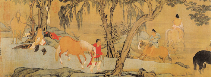 在绘画理论上, 赵孟頫提倡复古, 主张“画贵有古意”、“若无古意, 虽工无益”, 崇尚唐人, 反对南宋“院体”画中柔媚纤巧之风。强调书法与绘画的关系,将书法用笔入画加强其艺术表现力。《浴马图》画一湾池水,岸上梧桐垂柳,绿荫成趣,岸树溪流有奚官9人洗刷群马,亦有数马散卧溪边。画中人与马动作相互呼应,生动有致。画风师法唐人,古雅中兼有逸趣,为元代“文人画”特色。