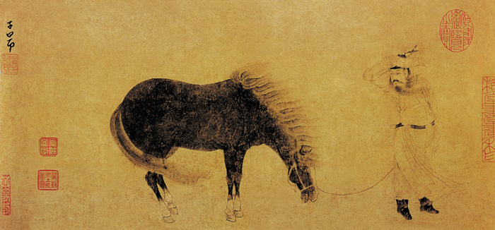 赵孟頫是一个早熟而多能的画家, 其绘画渊源, 具体表现在力追晋唐和北宋风貌。其工笔重彩人物鞍马, 取唐人风范, 法度严谨, 风格古朴。白描人物则师法李公麟。《调良图》仅画一矫健的、长鬃毛的马和一奚官,毫无背景,但从奚官飘拂的衣袖、胡须及被风吹得往前倾的马的鬃毛、马尾来看,当时似乎狂风大作,已力透纸背,直往观者刮来。