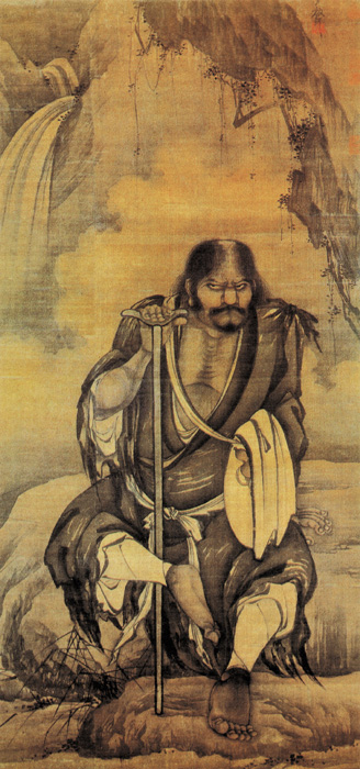 元 颜辉 绢本水墨淡设色 纵146.5厘米 横72.5厘米 北京故宫博物院藏 图中以写意画法塑造拐仙形象,主人公坐于磐石之上,披发、浓须、袒胸赤足,衣衫褴褛。其左脚踏地,右腿弯曲,右手扶拐,左手按于坡石之上,袖笼葫芦,狞眉怒视,嘴角紧闭,神情庄严冷峻,一副令人不可侵犯的气势。其背景为悬崖、飞瀑、雾岚,山石作大斧劈皴,墨气淋漓,云霭人淡墨渲染,舒卷有致,崖间枯藤与溪边芦荻以方笔写之,转折有力,硬峭刚劲,营造出一种神氦莫测、幽冥怪异的气氛。画家善于从仙人的衣衫破烂的外表来突出其不同凡响的人物性格与精神力量。 |