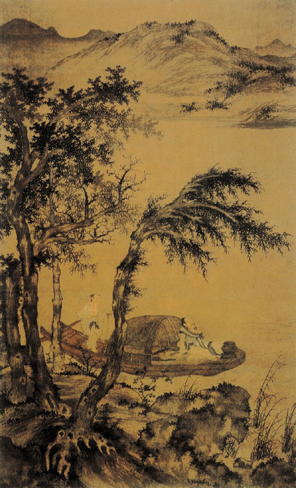 唐棣(1296—1364),字子华,号遁斋,吴兴(今浙江省湖州市)人。出身于官宦世家,自幼聪敏好学,工诗文、善书画,有“奇童”之称。曾参与集庆(今江苏省南京市)龙翔寺壁画绘画,为皇帝所赏识。作品多描写农夫、渔夫及各种活动场景,极富生活气息。《霜浦归渔图》画法以工笔为主,而又有多种变化,运思布局细密精整。画面取近景布局,林木参天,窠石流泉,渔民三人抡鱼网穿行而过,谈笑自得,神态生动,人物刻画细致。