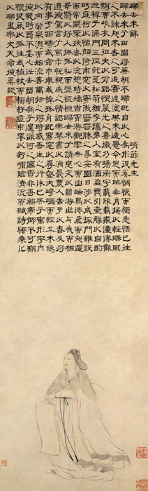王仲玉(14世纪前后),洪武中以能画召至京师。此幅《陶渊明像》是画家用白描手法绘制的一幅肖像画。笔简意远,笔墨潇洒淡逸,颇有元人风格。画中的陶渊明瘦骨清像,仙风道骨,很有隐者之风。画家笔力劲健,刻画人物入木三分,陶渊明那种愿意隐遁山林的性格和内在思想,都在画面中得到了很好的体现。
