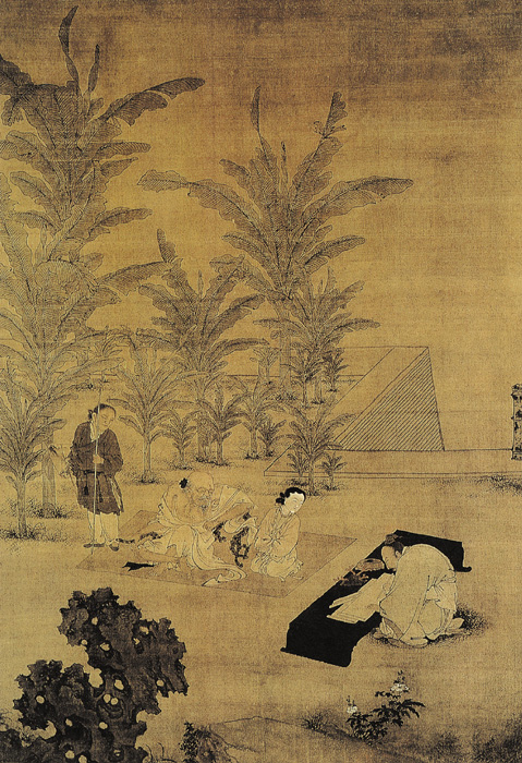 此图布势跌宕起伏,运笔迅疾顿挫,具豪迈放逸意趣。这种繁简结合、工写相兼的表现手法,在他的其它作品中也同样可以见到,反映了较全面而娴熟的技艺。伏生为汉代济南人,字子贱,原为秦博士。秦始皇焚书坑儒后,儒学受到极大打击,至西汉文帝时,求能治《尚书》的人,时伏生已年九十余,老不能行,文帝使晁错往受,得二十八篇,即所谓《今文尚书》。此图表现的即是这个题材,图中倚坐在方席上的老者即是伏生,鬓发苍苍,老态龙钟。