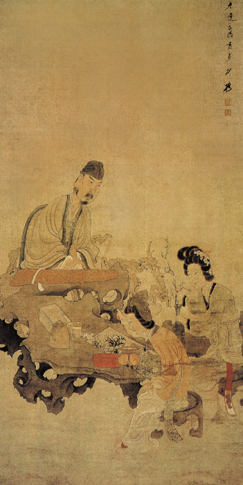 画中人物的密与背景的疏形成对比,使人物的形象更富于真实感,产生了很强的视觉效果。人物形象夸张,身体的线条圆转,但并不讲究比例,这反映了文人绘画脱略形似的审美意识,虽不求形似,但夸张的形象却更加传神,绝无令人生厌的媚态。图中画一位学士据案而坐,石案为太湖石制成,案上置有书画、茶壶、杯等物。学士手执如意,前视二位女弟子。二位弟子坐于圆凳,一位低头凝视案上的画,另一位正往瓶中插花。