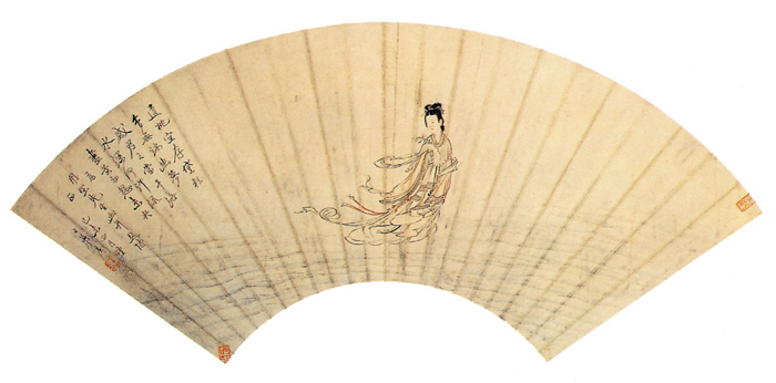 清初盛行文人山水画,仕女画被视为“习者之流”作品,曾经归于沉寂。清中期以后才逐渐兴盛。萧晨,生年不详,约卒于康熙中叶,字中素,号灵曦,扬州人,工诗,亦善画工笔山水、人物。萧晨此幅《洛神图》所表现的洛神举止优雅,姿态妩媚。