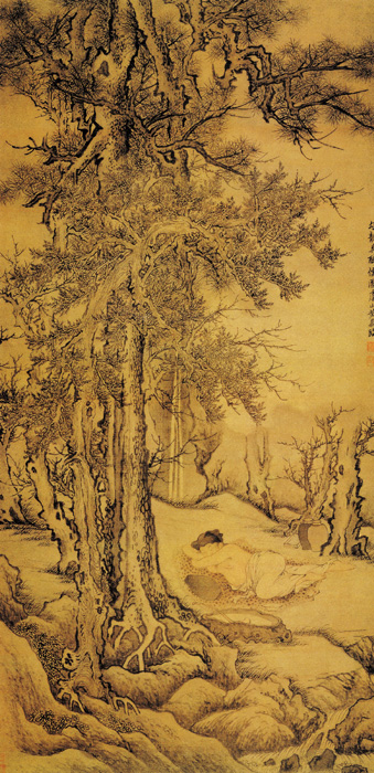 黄鼎(1650—1730),字尊古,号旷亭,别号闲浦、独往客、净垢老人等,江苏常熟人。擅画山水,王原祁的弟子。画面上绝大部分内容是参天的松柏、树丛与坡石构成人物的环境,显得雄伟、幽深,是隐居者的处所。树间空地上一儒者赤着上身伏地而眠,周围散堆着几个酒坛,归隐山林的隐士生活之不拘、性格之不羁均被表现得淋漓尽致,也是作者心仪的一种生活方式。画面中,酒坛旁还有一部书函,可见画中人虽则爱酒成痴,亦是以书为命,不能不以一个“儒”字称之。