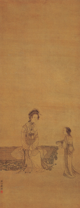 华喦的谷物画,内容多描写平凡而丰富的现实生活与社会现象。他远师李公麟及明季诸家,中年以后取浊陈洪绶,在创作中观察细致,注重人物内心刻划及线描的运用,使作品被赋予了极强的艺术表现与感染力。《白描仕女图》属早年白描仕女,工细谨严,一丝不苟。