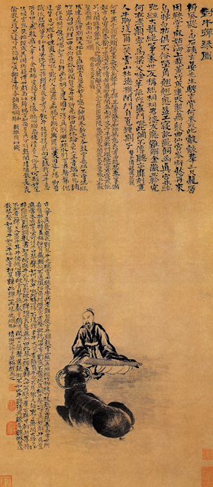 此画构图奇险,笔墨老到,意境突出,是石涛人物画杰作。“对牛弹琴”一词本是讥笑说话的人不看对象。但此图通过作者自题“世上琴声尽说假,不如此牛听得真”等诗句,反映出作者难遇知音,而只能寄托于“牛声一呼真妙解”,反映了作者孤独落寞的心境。