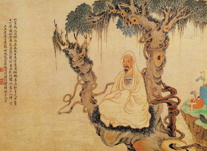 钱东字东臬,号袖海,又号玉鱼生,浙江杭州人。他与改琦之间相聚的时间虽不长,但情谊甚笃。此图为1823年改琦寓居扬州时为钱玉鱼的写照。因改琦对钱东的个性十分了解,所以能很好地表现出钱东与凡尘悬隔的“禅定遗照”。画面上人物趺坐于“贝多罗”树丫的“蒲团上”。钱东敛心,参禅,澄性养身,超脱世尘,面壁成佛的形象,反映了玉鱼老居士虔诚于佛心的志向。而旁边石案上放着的贝叶、经卷和灵芝、石磬之物,更是为了衬托出人物的性格。 |