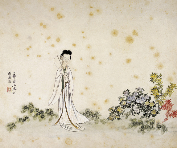 改琦(1773—1828),字伯蕴,号香白,又号七芗,家松江(今上海市),工人物,佛像,仕女,笔意秀逸潇洒,著有《玉壶山房词选》。此轴是典型的清人仕女画风格,人物强调纤瘦、清秀,面庞椭圆,疏眉、细眼、小口。