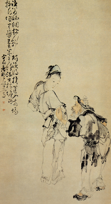 《渔翁渔妇图》画一渔翁身背鱼篓, 手拈鱼钩, 钩上挂一小鱼, 笑容可掬, 面向渔妇, 似叙家常; 而渔妇则回首目对渔翁, 聆听其述, 渔翁渔妇, 动态生动, 呼应密切, 充满生活之乐趣。此画人物衣纹作铁线描, 连勾带染, 洒脱随意, 更加以草书之笔入画, 极为自由流畅, 属水墨大写意, 仅于渔翁面部、手部略施淡赭。